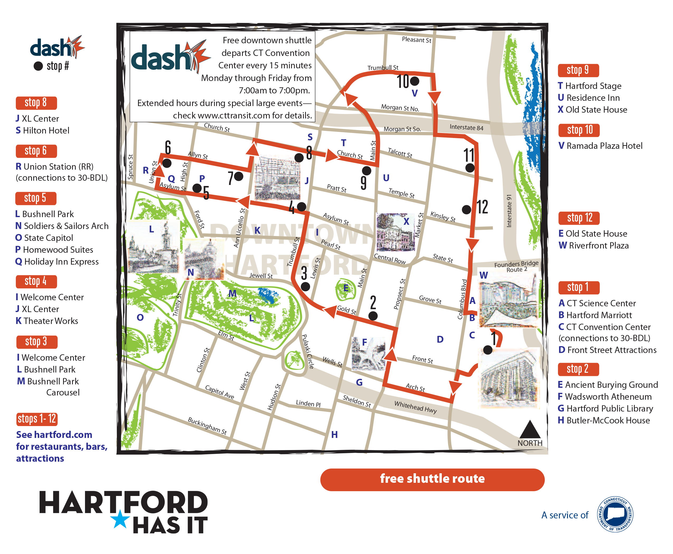The dash Shuttle route connects the CT Convention Center, the Riverfront, the CT Science Center, the Arts and Entertainment District, various restaurants, and downtown hotels.